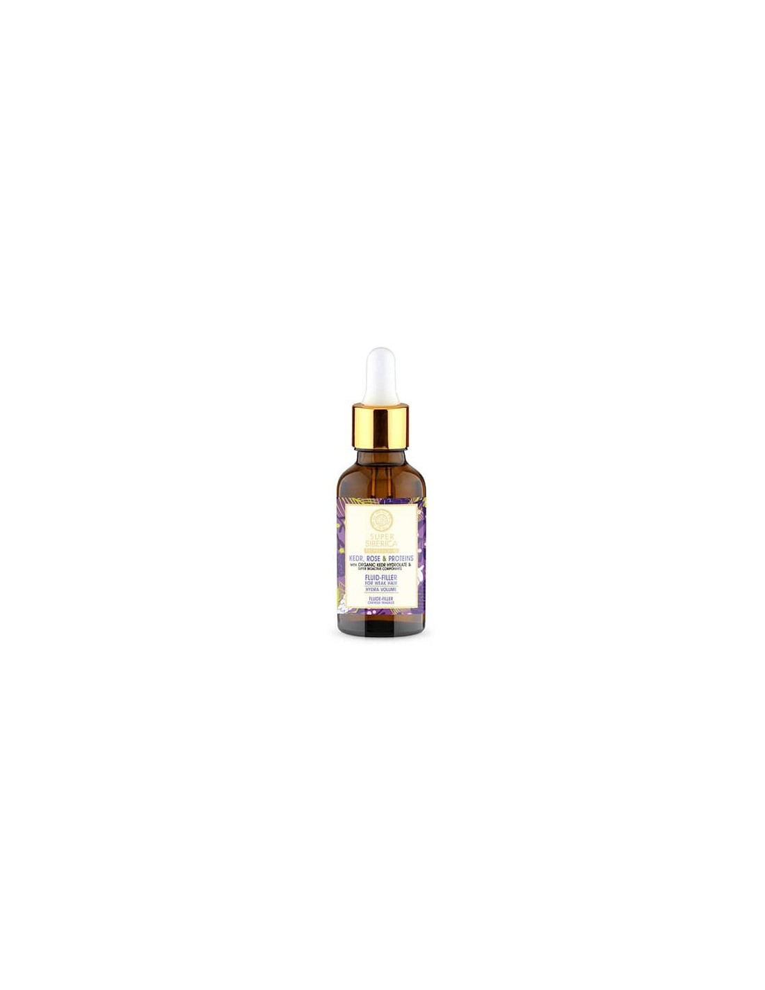El rellenador fluido de pino, rosa y proteínas, basado en hidrolato de pino siberiano orgánico, ayuda a fortalecer eficazmente el cabello débil y lo deja fuerte y brillante. El fluido rellena y deja el cabello más grueso cubriéndolo de raíces a puntas a la vez que lo deja suave y sedoso. Además, le otorga esplendor y volumen.